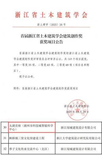 近日,首届浙江省土木建筑学会建筑创作奖名单正式揭晓,经评审委员会专业评定及公示,中国节能·太湖首座项目获一等奖。