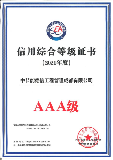 此次信用综合评价指标涵盖经营业绩、人员结构、内部管理、社会贡献、企业荣誉以及企业不良行为记录等六大内容近33项,工程造价咨询企业信用是企业履约能力、履约效果、遵纪守法、历史信用记录等的综合反映,全面综合考核企业诚信建设和信用管理能力及水平。 获此殊荣,是行业对德信成都AG电子网站造价咨询业务能力的高度肯定和认可。德信成都AG电子网站将持续强化造价咨询业务能力,培养行业人才,打造精英团队,为成为全过程咨询行业领军企业奠定坚实基础。